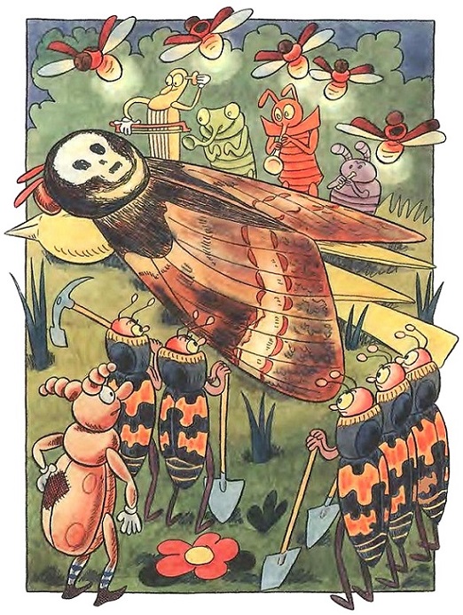 Словом, сюда шла похоронная процессия. Впереди и по краям освещали дорогу светлячки, за ними шли ночные бабочки в траурных одеждах, затем музыканты – ночные цикады, сверчки и прочие стрекоталки, которые играли траурный марш. Замыкали шествие жуки-могильщики14 с лопатами и кирками.