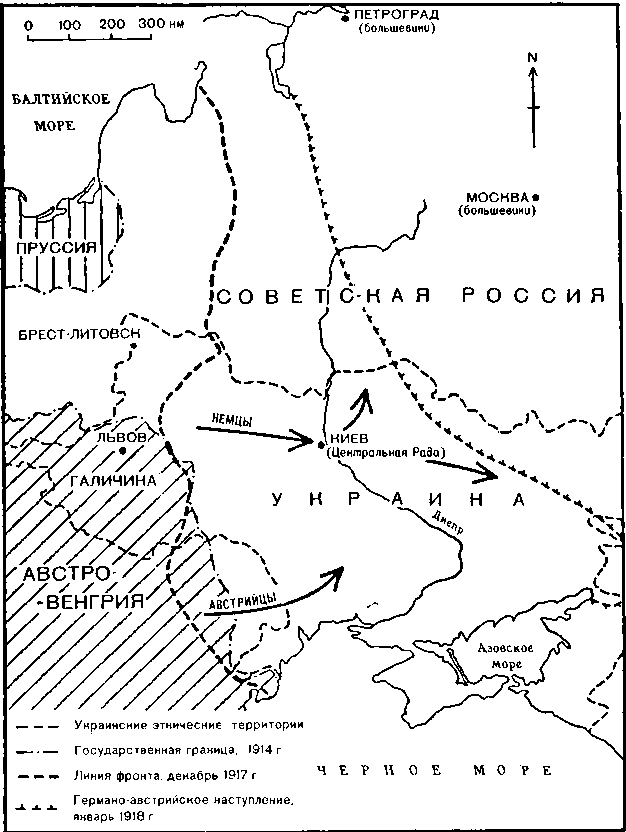 Приход к власти большевиков в России не только ознаменовал для многих украинцев наступление новой, полной насилия фазы послереволюционного периода, но и радикально изменил их политическое мышление. Неприятие диктаторской природы 'большевистского режима на севере неминуемо вызвало отказ многих украинских лидеров от их традиционного тяготения к автономно-федеральным связям с Россией. Поэтому их главной целью стала независимость. Тем не менее среди украинцев, как и у других народов бывшей империи, нарастали противоречия по поводу путей и методов достижения тех или иных целей. Вдобавок ко всему почти каждая сторона, участвовавшая в гражданской войне, стремилась установить контроль над Украиной с ее выгодным стратегическим положением и богатейшими природными ресурсами. После паузы относительного спокойствия, вызванной немецкой оккупацией, Украина стала ареной наиболее запутанных, хаотических событий гражданской войны.