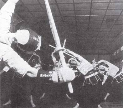 Курсанты Йокарен разминаются перед началам занятий по кендо. Проведение параллелей между Императорскими вооруженмг/ми силами и средневековыми самураями было важной частью обучения и тренировки японских военнослужащих перед Второй мировой войной. (Эдвард М. Йонг)