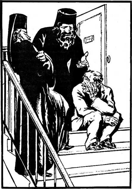 На лестнице, когда спускался Порфирий Калистратович, с ним повстречались вчерашние монахи. Очень низко поклонились ему, но он не обратил на них внимания.