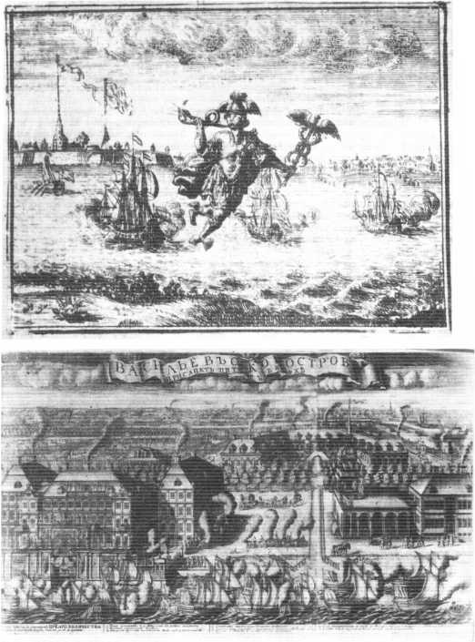 А. Ф. Зубов. Вид Васильевского острова и триумфального ввода шведских судов в Неву 9 сентября 1714 г. после победы при Гангуте. 1714. Офорт, резец,