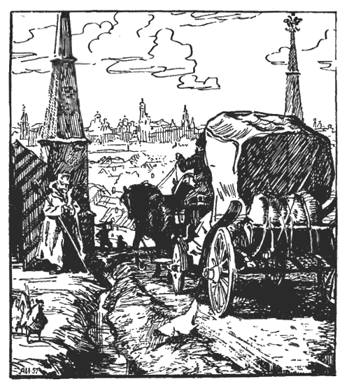 У полосатой будки их встретил толстый квартальный с алебардой в руках; замелькали колодцы, заборы, деревянные и каменные дома, кузницы, калашные лавки, церкви с толпящимися на папертях нищими. По улицам грохотали «гитары» (извозчичьи дрожки, на которых ездили сидя верхом или боком). Проносились собственные выезды богачей. Шныряли разносчики. Где-то заливалась шарманка, без конца повторяя мотив «Стрелочка».