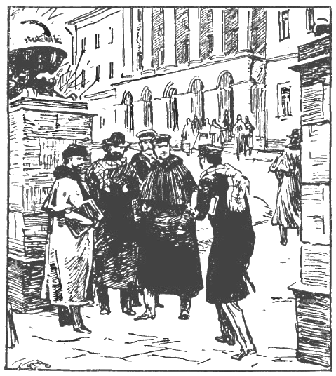 Поодаль стоял будочник (городовой) в мохнатой шапке, неодобрительно поглядывавший на шумящих студентов.