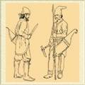 Реконструкция по описанию Геродота и археологическим находкам: пеший лучник (слева); конный лучник, вооруженный кроме характерного скифского лука в горите и копья, еще и чеканом, оружием ближнего боя, предназначенным для пробивания доспехов.