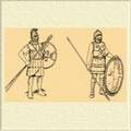 Слева направо: халдейские пехотинцы армии Ксеркса составляли первый ряд персидской «фаланги» лучников. Воины персидской армии: вавилонский лучник; ассирийский пехотинец. На воинах надеты стеганые куртки, набитые конским волосом – характерный тип восточного доспеха того времени.