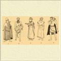 Стенная роспись: 1 – жрец в парадной одежде. Изображение на терракоте; 2 – знатный мужчина, Лагаш. Изображение на терракоте: 3 – знатная женщина или царевна, начало XVIV в. до н. э. Мари. Со скульптуры; 4 – вавилонянин. XVIII в. до н. э., изображение на стеле; 5 – дворцовый работник