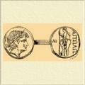 РЕВЕРС. Юноша, опирающийся на суковатую палку, держащий под левой рукой меч и поставивший ногу на скалу. Надпись по-гречески: «ЭТОЛИЯ» и две латинские буквы «Nl», начало имени магистрата.