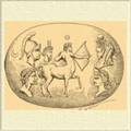 Резной камень из кроваво-красной яшмы. Справа вверху – Марк Аврелий в покрывале верховного понтифика; поверх покрывала – шар; позади него – жезл авгура; напротив императора – богиня Рома в шлеме и Эскулап с рогами; под изображением Марка Аврелия – Гигиея, напротив нее – Фаустина. Стрелец в центре символизирует время жертвоприношения (ноябрь или декабрь).