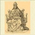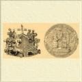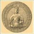 Справа: печать Пражского университета, основанного в 1348 г. Император Карл IV,преклонив колени перед покровителем университета, святым Вацлавом, подносит ему грамоту об основании университета.
