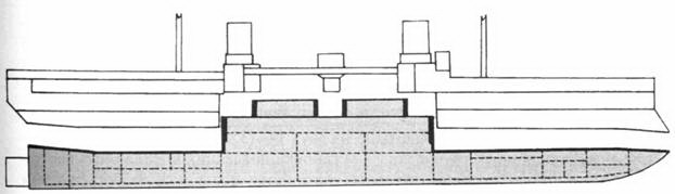 Концепция «Инфлексибла» небронированная, но обладающая достаточной плавучестью надстройка поверх корпуса-«плота». ограниченного сверху броневой палубой. а в центре – мощной броневой цитаделью
