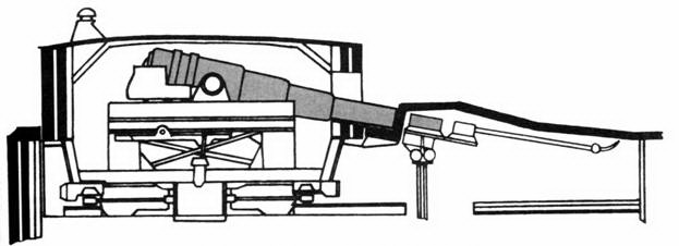 Вследствие увеличившейся [до 18 калибров. – Ред.] длины ствола заряжание производилось из-за пределов установки: двойные неподвижные зарядные посты находились под 76мм броневой палубой, перекрывающей цитадель сверху. У основания установок вдоль бортов (в корму от левой башни и к носу от правой) палубная броня несколько приподнималась в виде гласисов и, когда стволы опускались в положения заряжания, они оказывались ниже кромки этого гласиса, под защитой которого прибойники (также оснащённые гидроприводами) последовательно досылали в канал ствола заряд и снаряд. Новая система определённо являлась заметным улучшением по сравнению с зарядными портами на «Тандерере».