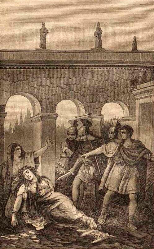 До сих пор она была далека от дочери, но, когда ту постигло несчастье, мать пришла к ней и, как истинная римлянка, стала советовать не дожидаться позорной казни, а убить себя самой. «Для тебя, моя дочь, уже все кончено, – говорила старушка, – остается только честно умереть». Но Мессалина не слушала этих советов матери, горько плакала, жаловалась и ломала с отчаянием руки. Между тем вдруг упала дверь сада и явилась масса солдат. Тут только Мессалина поняла, что для нее все уже кончено. Трепещущей рукой она взяла нож, ударила себя по горлу и в грудь, но не имела духа сделать это, как следует – убить себя; один из трибунов ей помог ударом меча.