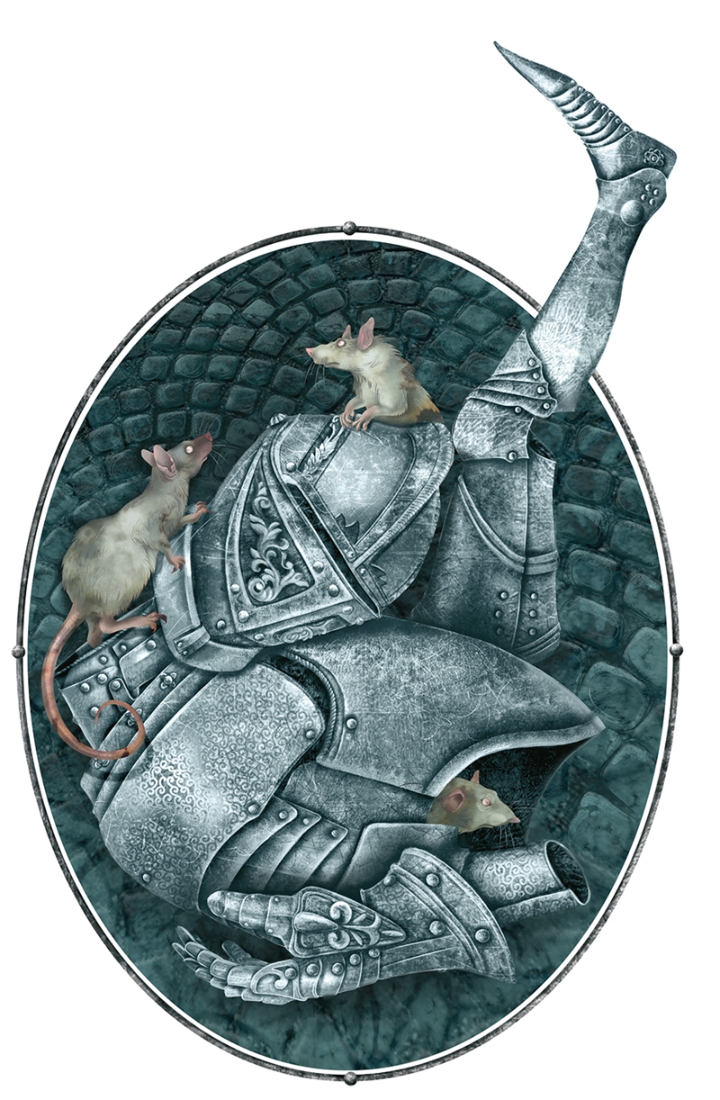 Кроме того, это было его собственное облачение. Он носил его с большим успехом на турнире в Кенильворте и удостоился выслушать по поводу его много лестного от самой королевы-девственницы. Но когда он теперь надел доспехи, он окончательно свалился под тяжестью огромного нагрудника и стального шлема и в изнеможении упал на каменный пол, сильно ушибив оба колена и разодрав кожу на пальцах правой руки.