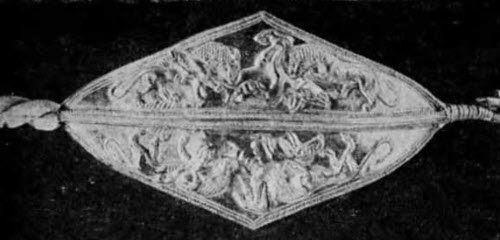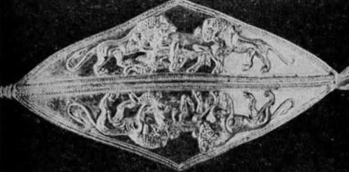 Руку ниже локтя охватывали золотые браслеты со скульптурными изображениями кабанов и головками баранов. На пальцах были 5 золотых перстней, один из которых (со щитком) представлял собой печать. На поясе были нашиты геральдические символы – пластинчатые золотые фигурки орлов с распростертыми крыльями. Кроме того, в погребении в большом количестве найдены серебряные сферические бусины, трубочки и весьма разнообразные подвески (бипирамидальные, ребристые и т. д.), которые, очевидно, нашивались на платье. Не дошедшее до нас погребальное покрывало было расшито золотыми орнаментированными пластинками и пуговками. Всего в этом погребении обнаружено свыше 3 тыс. золотых и серебряных предметов. О некоторых из них следует рассказать более подробно.