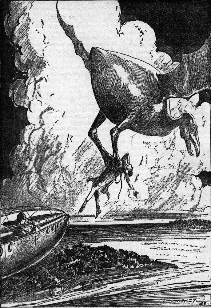 Он развернулся и помчался туда, где стоял его воздушный корабль. Запрыгнув в кабину, он захлопнул дверь. Маленькое судёнышко стремительно взмыло на высоту более двух тысяч футов. Гнарш был уже более чем в миле от них и, размеренно взмахивая крыльями, быстро летел на запад, а его жертва безвольно болталась в его когтях.