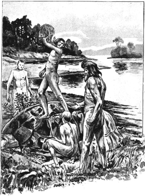 Раздвинув густую чащу кустарника, он вышел на поляну и остановился шагах в двадцати от наших путешественников. Опершись локтем на свою длинную дубинку, он устремил на европейцев немного любопытный, немного удивленный взгляд своих спокойных и добрых глаз, в которых светилась уже искра разума и мысли.