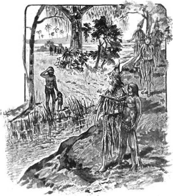 Между тем молодой человек, приведший наших путников, обратился к своим родным и в немногих словах рассказал им о своей встрече с людьми другого берега и об их желании снова перейти на ту сторону большой реки.