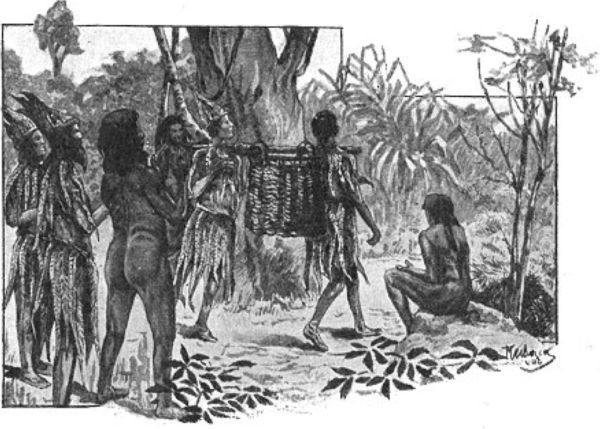 С большим трудом спустившись с дерева, они нашли местных жителей давно уже вставшими. Трое детей весело плескались в речке, тогда как трое старших хлопотали над сооружением новой корзины. Плели они ее без всякой системы, как придется, скрепляя между собой неровные и сучковатые прутья, и при этом укладка каждого из них представляла для этих людей совершенно самостоятельную и подчас нелегкую задачу.