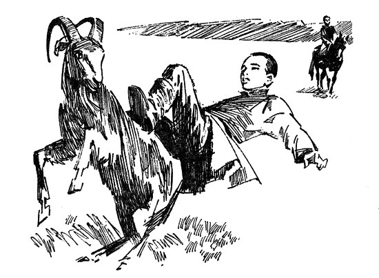 Зориг нарвал дикого лука, протянул козлу. Тот потянулся губами к зеленым росткам. Зориг изловчился, вскочил ему на спину и ухватился за хвост. Козел взбрыкнул и рванулся с места. Зориг грохнулся на землю. Он сморщился от боли и сквозь слезы посмотрел на козла. Не обращая внимания на незадачливого наездника, козел свободно и легко побежал от него в степь.