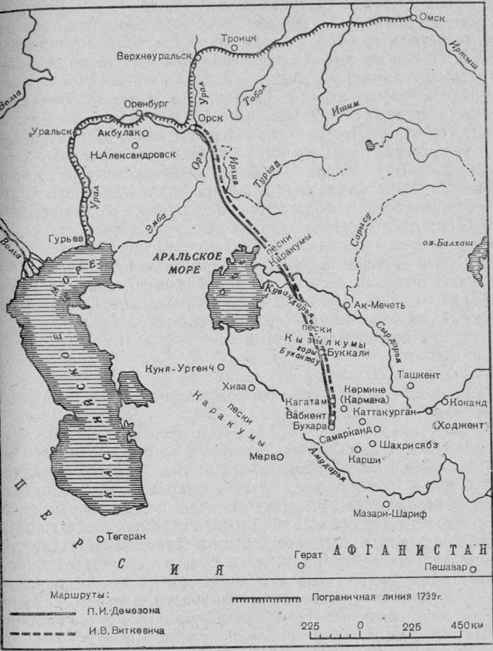 Тут мы узнали, что две огромные шайки ташкентцев, в одной человек 800, в другой до 2 тыс., грабят впереди нас и спустились уже на запад, к пределам Хивы. Весть эту привезли двое кайсаков, которые едва ушли, между тем как товарищей их переловили. Ташкентцы были верстах в 50 от нашего каравана, звали, что он стоит здесь, но, как посол ташкентский находился о ту пору в Бухаре, не осмелились напасть на караван. Любопытно, что посол прибыл под конвоем шайки этой и отделился в Бухару, а они поехали своим путем на грабеж и правеж. Поэтому взяли мы на обратном пути своем далее на восток, ближе к Ташкенту, между тем как идучи туда, придерживались к западу, к Хиве; миновав опасность, спустились мы на запад и дошли благополучно до чумекейских аулов, за Куваном. Здесь караван разбрелся по аулам, купцы начали торговать, в ожидании весны, потому что здесь была еще глубокая зима и каравану итти было невозможно; но караваны обыкновенно спешат выходить из Бухары, чтобы захватить еще зимный путь через Куван и Сыр, потому что летняя переправа крайне затруднительна. Мы прокочевали с аулами, которые шли на север, к Иргизу, шесть недель. За Иргизом отделились мы от аулов и пустились в путь, прямо на Орск, куда оставалось верст до 500. Чрез Иргиз переправились мы уже вброд. Нас было всего 9 человек: я, Гусейн, два татарских приказчика, с ними два кайсака, помянутый вожак Бик-Батыр, мальчик его и, наконец, султан Санали. Люди мои оставались с верблюдами. Мы прибыли в Орск на 8-й день.