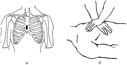 Для этого больного необходимо уложить на твердую поверхность (если он лежит в постели – быстро перенести на пол). Затем нанести прекардиальный удар кулаком с высоты примерно 30 см в среднюю треть грудины. После этого начать проведение закрытого массажа сердца. Для этого фельдшер кладет одну ладонь на другую и резким толчком надавливает на грудину больного в ее нижней трети (рис. 1).