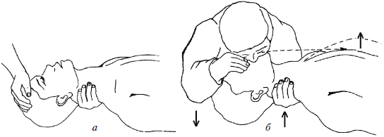 Для этого оказывающий помощь становится на колени у изголовья пострадавшего, одну руку кладет под шею, другую на лоб и запрокидывает его голову назад. При этом рот больного открывается, дыхательные пути становятся проходимы (рис. 3). Если во рту больного находятся зубные протезы, другие инородные тела или рвотные массы, их необходимо удалить. Голова больного при этом должна быть повернута в сторону из-за опасности аспирации.