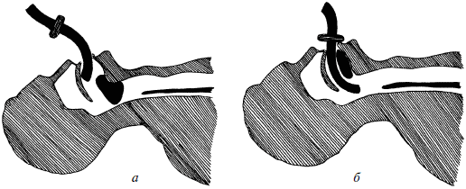 Для предупреждения западения корня языка у больного в бессознательном состоянии следует ввести воздуховод. Его размер определяется расстоянием от мочки уха больного до угла рта. Воздуховод берут так, чтобы его изгиб смотрел вниз, к языку, а отверстие вверх, к небу; его вводят в рот и продвигают вглубь, касаясь концом нёба. Введя воздуховод на 1/2 длины, его поворачивают на 180° и продвигают дальше, пока фланец на наружном конце не упрется в губы (рис. 4).