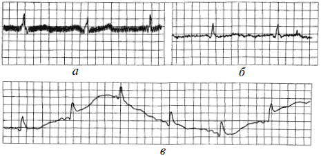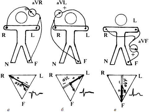Рис. 9. Усиленные отведения от конечностей: а – отведение от правой руки aVL; б – отведение от левой руки aVL; в – отведение от левой ноги aVL