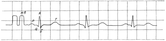 При записи ЭКГ со скоростью 50 мм/с 1 мм на ленте соответствует отрезку времени 0,02 с, 5 мм = 0,1 с, 10 мм = 0,2 с и т. д.