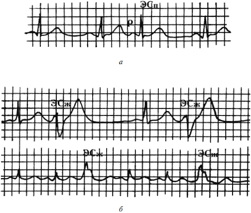 Иногда встречаются внеочередные сокращения сердца, которые называются экстрасистолами (ЭС) (рис. 14).