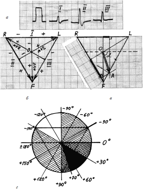 В приведенном примере в отведении I высота зубца R = 4 мм, S = 1,5 мм; общая амплитуда = 4–1,5 = 2,5 мм. Найденное число откладываем на треугольнике Эйнтховена на положительную часть оси I отведения (рис. 15в). Для удобства и более точных измерений будем удваивать все найденные значения, хотя это не обязательно. Если бы у нас получилась отрицательная величина, ее следовало бы отложить влево от средней точки оси, а не вправо, как в примере. Затем восстанавливаем перпендикуляр из конца полученного отрезка к оси отведения. В качестве линейки можно использовать кусочек ленты ЭКГ, с ее же помощью достаточно просто начертить и сам треугольник. Затем находим сумму амплитуд зубцов QRS в отведении II. Q = 0,5 мм, R = 11,5 мм, S = 3 мм. Получаем: 11,5–0,5 – 3 = 8 мм. Увеличиваем вдвое и откладываем полученную величину на положительную часть оси II отведения, затем из конца отрезка восстанавливаем перпендикуляр к оси II отведения. Соединяем центр треугольника О с точкой альфа пересечения перпендикуляров. Это и будет электрическая ось сердца. Теперь измерим угол альфа между горизонтальной плоскостью и полученной осью. В нашем примере он равен 70 °C. Это и будет положением электрической оси сердца. Однако в описании ЭКГ положение ЭОС в градусах не выражают. Если угол составляет: