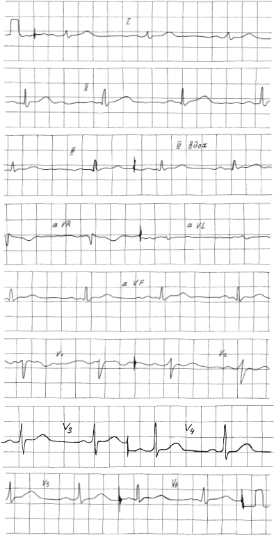 При аритмии у больного в отведениях I–III записывают по 8-10 комплексов. При необходимости длительной регистрации ЭКГ ее записывают со скоростью 25 мм/с, обычно после стандартной записи во всех отведениях.