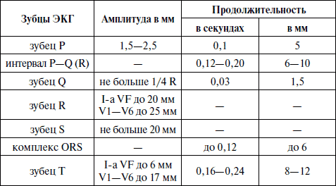 Большое значение в этом случае имеет сравнение вновь снятой ЭКГ со старыми. Если эти (или другие) изменения возникли впервые, особенно в ближайшие дни или часы, требуется обязательная неотложная помощь. Если те же изменения отмечались на ЭКГ 3–4 месяца назад и ранее, можно думать о хроническом процессе, рубцах после перенесенного инфаркта. Таблица 1. Параметры ЭКГ