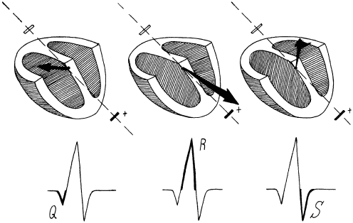 Комплекс QRST соответствует систоле желудочков. Волна возбуждения распространяется по желудочкам в разных направлениях в разные моменты времени, при этом на ЭКГ формируются зубцы Q, R и S (рис. 7).
