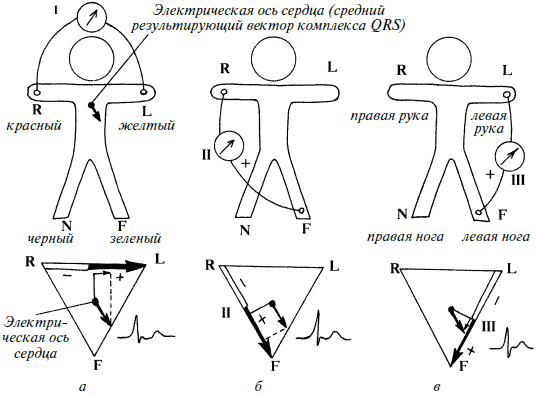 Электрокардиографические отведения I, II, III, aVR, aVL и aVF позволяют сделать как бы срез сердца во фронтальной плоскости, определить положение ЭОС. Черный электрод на правой ноге во всех случаях используется как нейтральный. Грудной электрод отключен, поэтому его неисправность не влияет на запись ЭКГ в шести отведениях от конечностей.