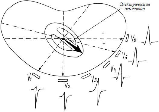 При записи ЭКГ в грудных отведениях все электроды на конечностях объединяются и подключаются к отрицательному полюсу гальванометра, а грудной электрод-груша – к положительному полюсу (он становится активным). Получается срез сердца в горизонтальной плоскости (рис. 10).