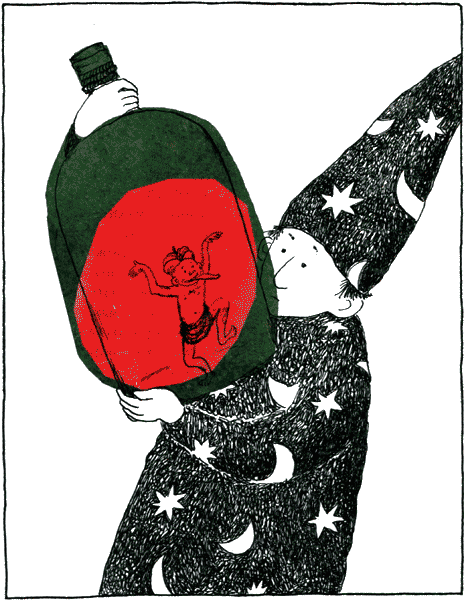 Как-то раз Великий Рододендрон послал его в подвал за бутылкой с запечатанным в ней джинном. Жужик с готовностью сбежал вниз по приступочкам и огляделся по сторонам. От восторга у него захватило дух: в подвале хранились всевозможные колдовские приспособления. На полках красовались магические шары из цветного стекла, на подставках выстроились в ряд волшебные палочки всех размеров, в банках с формалином плавали летательные снаряды ведьм – что ни говорите, а такие вредоносные штуки, как помело или метла, лучше держать в обеззараженном виде, – и десятки колпаков и шапок-невидимок, семимильных сапог и скатертей-самобранок. Вдоль стен были расставлены джинны – расфасованные-рассованные по бутылкам и наглухо запечатанные. Жужик облюбовал зеленую пузатую бутылку, замшелую и покрытую паутиной, и смахнул с нее пыль. Подержал бутылку против света, чтобы убедиться, что она не пустая, и увидел возмутительную картину: джинн – крохотная козявка, и посмотреть-то не на что – небрежно прислонился к стенке бутылки и дерзко показывает ему язык. Жужик сердито встряхнул бутылку, чтобы отплатить за обиду, но мерзкий шибздик опять высунул язык – Жужик в жизни своей не видывал такого отвратительно длинного языка – и противным голосом пропищал:
