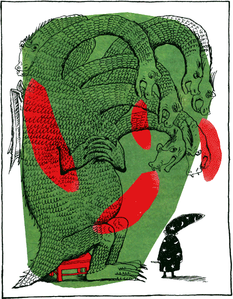 Жужик развернулся и, сгорая от стыда, выскочил из экзаменационной пещеры. Вернее, хотел выскочить, но семь голов не проходили в дверь, и одной из них он с такой силой стукнулся о притолоку, что из всех четырнадцати глаз искры посыпались. Бедняга кое-как протиснулся боком, чтобы бежать от позора.