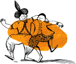 Жужик, Илюша Кирюша и Капля-Кроха настолько устали, что не в силах были слово вымолвить. Зато два храбрых джинна, обняв друг друга за плечи, пустились в пляс, распевая песнь победы: