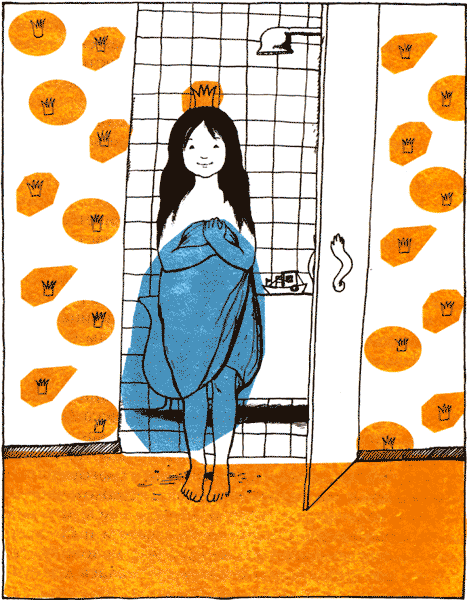 – Кто там? – раздался вдруг испуганный голосок, и в дверях ванной появилась принцесса Лореаль, кое-как прикрытая полотенцем и мокрая, как русалка, потому что выскочила из ванны. Она действительно оказалась красавицей из красавиц, вся благоухала лимонным шампунем и мылом «Зеленое яблоко»; черные волосы ее блестели, белая кожа светилась, и капли воды сверкали на ней, подобно алмазам и брильянтам, а на голове красовалась крошечная золотая корона, с которой королевна не расставалась даже во время купания.