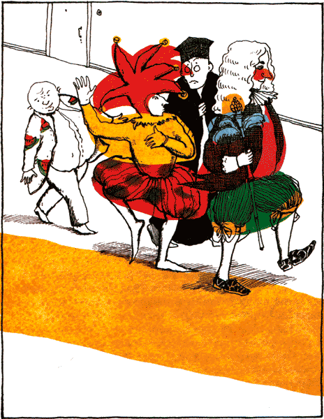 Чуть погодя позвонили в дверь к мудрецу и шуту, которые, конечно же, присоединились к процессии, самозабвенно ссорясь на ходу.