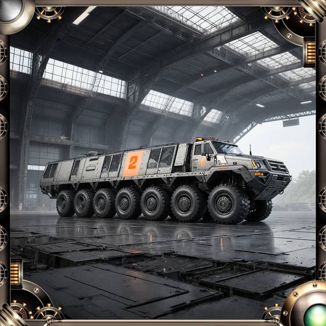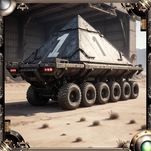 Двадцатиметровый в длину, три с половиной в высоту приземистый корпус. Массивная кабина впереди могла, казалось, вместить целый взвод тяжелых пехотинцев. Двенадцать огромных колес на шести осях. Все боковые части платформы – часть энергетической и двигательной системы. А также склад запасных частей. Передняя часть напоминает зубило, обращенное рабочей частью к земле. По идее, этот «малыш» может проехать по любому бездорожью. Не слишком толстые деревья для него не являются препятствием.