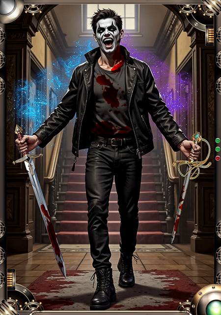 Весельчак показательно медленно шагает в сторону кресла, поигрывая обычным ножом, которым он заменил Буревестник в правой руке.