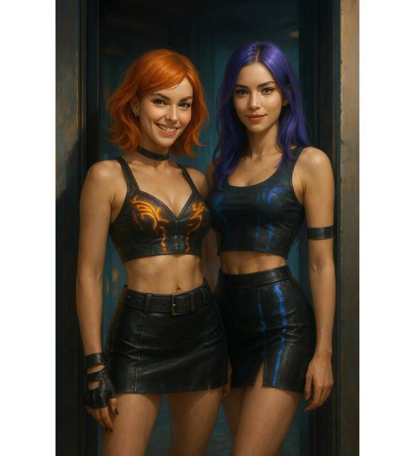 Дверь распахнулась с таким энтузиазмом, словно пыталась слететь с петель. В комнату вошли две девушки, обе в коротких кожаных юбках и топах, блестящих от какой-то световой краски. На лице одной из них, рыжей с пирсингом в брови, играла ехидная улыбка. Вторая, с выкрашенными в ядовито-фиолетовый цвет волосами, несла в руках объемистый черный чехол.