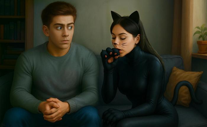 Она провела меня в гостиную. Девушка-кошка грациозно запрыгнула на диван, где свернулась калачиком. Затем похлопала лапой рядом с собой, приглашая сесть.