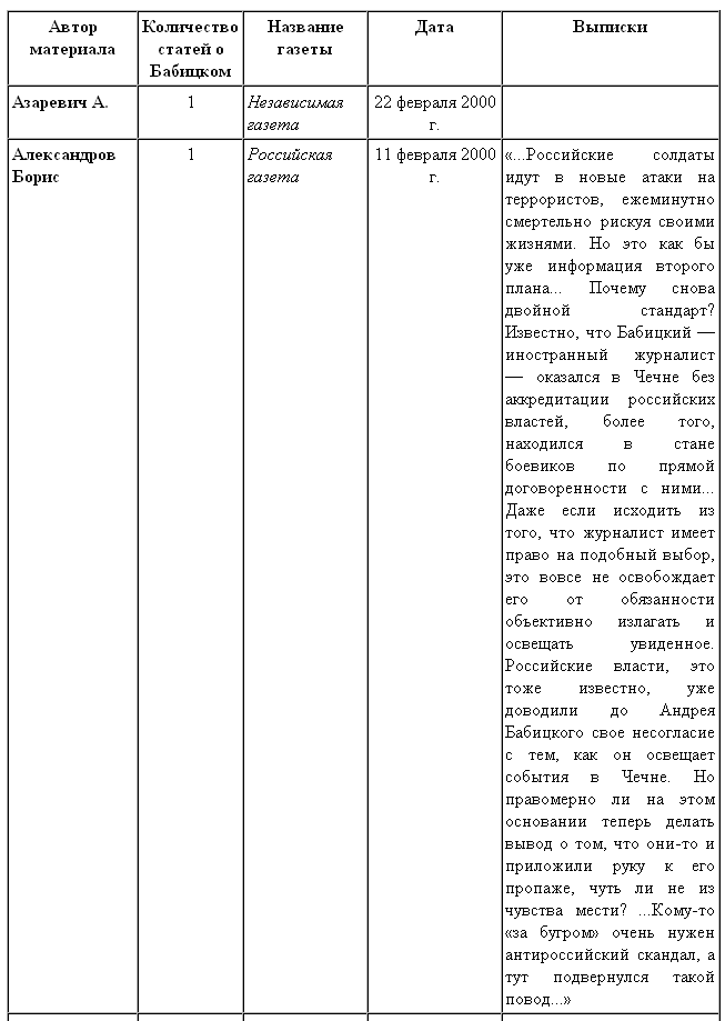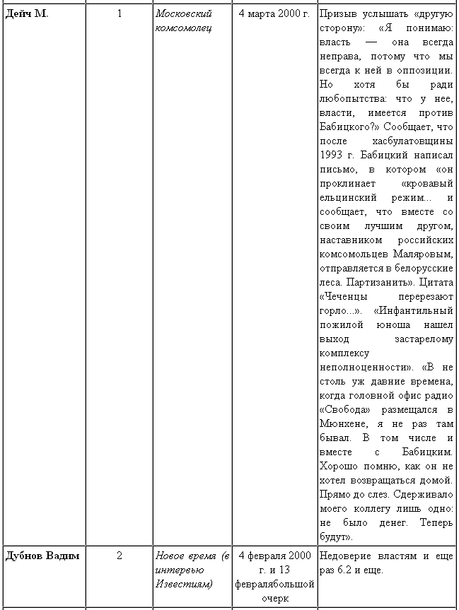 Третья группа изданий занимают четкую демократическую позицию, публиковали много материалов в защиту Бабицкого, предоставляя единичные возможности для противоположных высказываний (например, «Общая газета», издавшая даже специальный выпуск по делу Бабицкого, тем не менее опубликовала противоположное мнение В.Матусевича). Освещать общеполитические проблемы через проблему личную – традиционный ход для «Московских новостей», «Нового времени», «Общей газеты», и ход этот вполне профессионален.