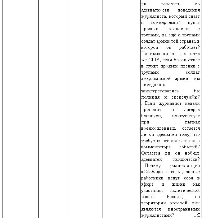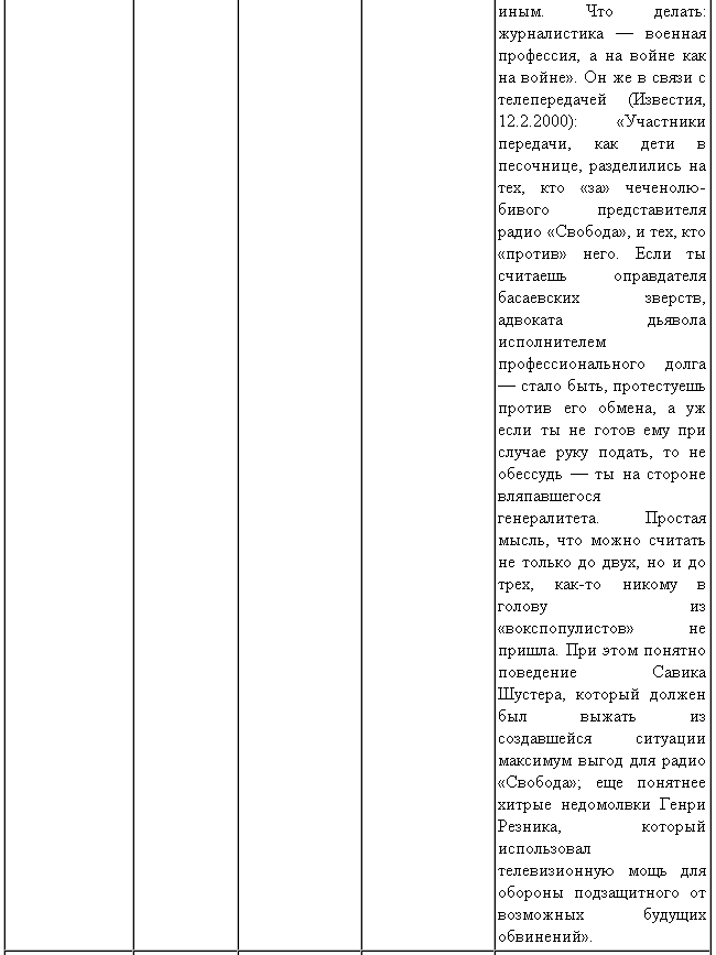 Или между журналистикой и чем-то иным, как полагал А. Архангельский, так и не сумевший определить это «иное»: «Как не поддаться соблазну перейти на одну из сторон информационного конфликта… Вполне вероятно, что им двигало желание спасти пленных солдат. Но (если только его не принудили силой), сделав первый шаг в сторону прибывших за ним боевиков, он не только пересек границу между Чечней и «собственно» Россией, но и границу между журналистикой и чем-то совсем, совсем иным» (А. Архангельский).