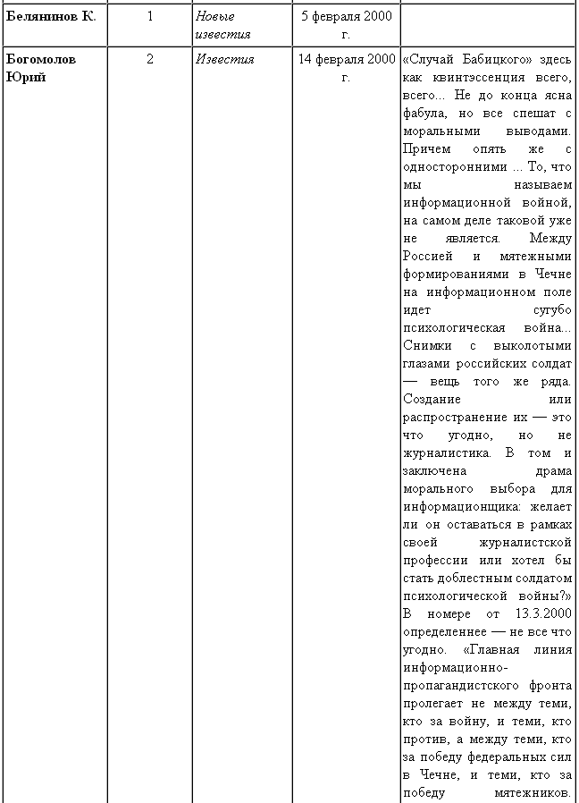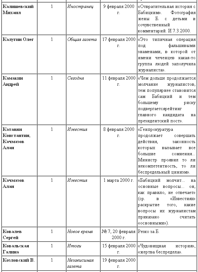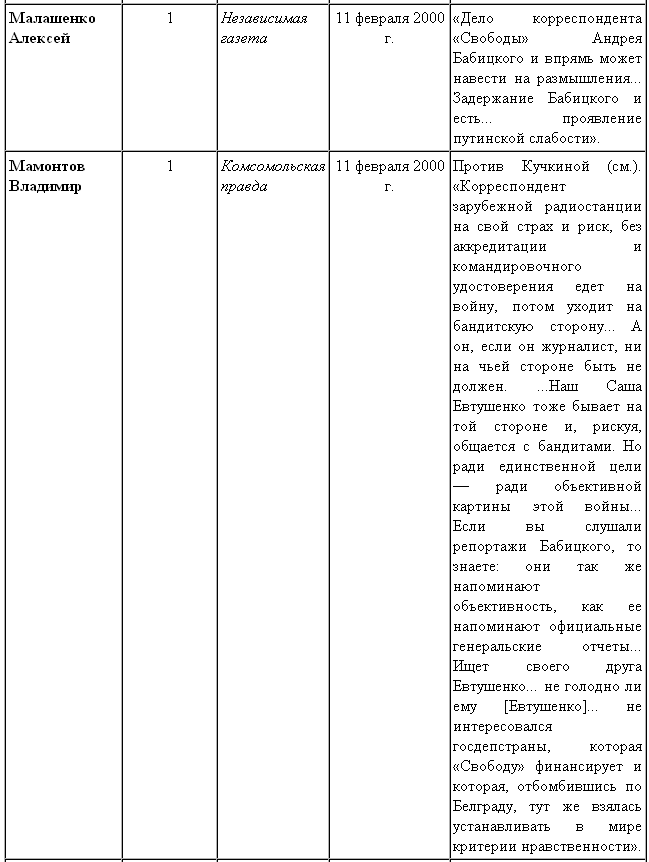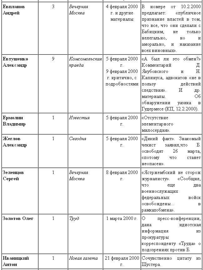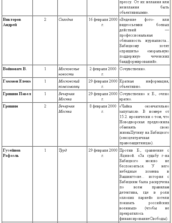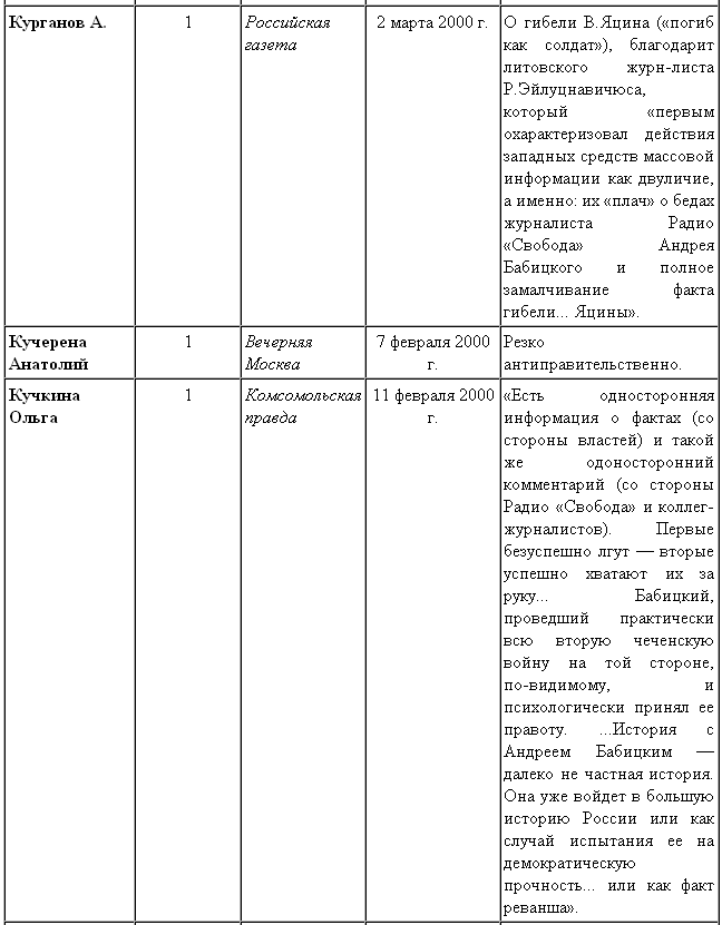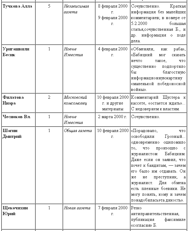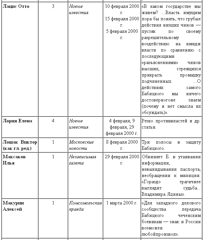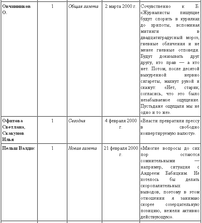Мифологизм давал себя знать в неадекватной оценке числа противников. Е.Крутиков, последовательно защищавший милитаристский лагерь, издевался над «десятком известных журналистов «перестроечного» поколения» – на самом деле, как видно из табл. 2, в защиту Бабицкого выступило большинство журналистов, шесть десятков человек разного, видимо, возраста. В.Третьяков, напротив, приуменьшал количество противников Бабицкого и намекал на «демократическую цензуру»: «Все больше действительно честных журналистов боятся не то что возразить – даже сказать о случившемся не в тех выражениях и не тем тоном, что продиктован «Свободой» (В.Третьяков). Фраза, кстати, внутренне противоречива, не говоря уже о несоответствии ее фактам, ибо «действительно честный журналист» не будет поддаваться никакой цензуре – если поддается, значит, уже не честный. Впрочем, со стороны демократов тоже встречались необоснованные обобщения: «Самым поразительным… было то единодушие, с которым журналисты из самых различных изданий – и конкурирующих, и находящихся на различных политических позициях, и принадлежащих различным финансовым группам – осуждали действия властей… Заговорили на митинге, а не в своих изданиях, из которых «тема Бабицкого» под давлением закамуфлированных, но легко угадываемых сил начинает исчезать» (В.Яков).