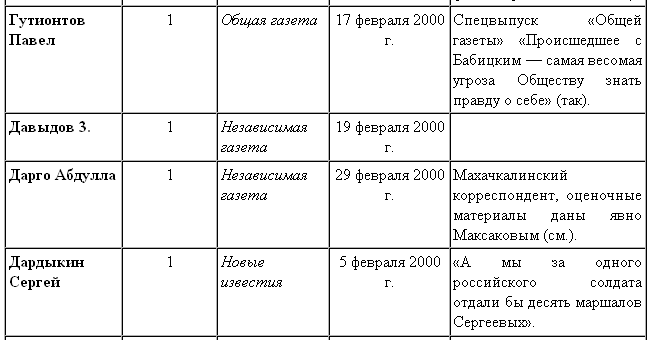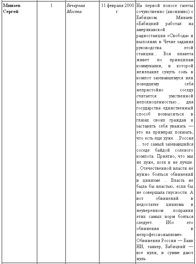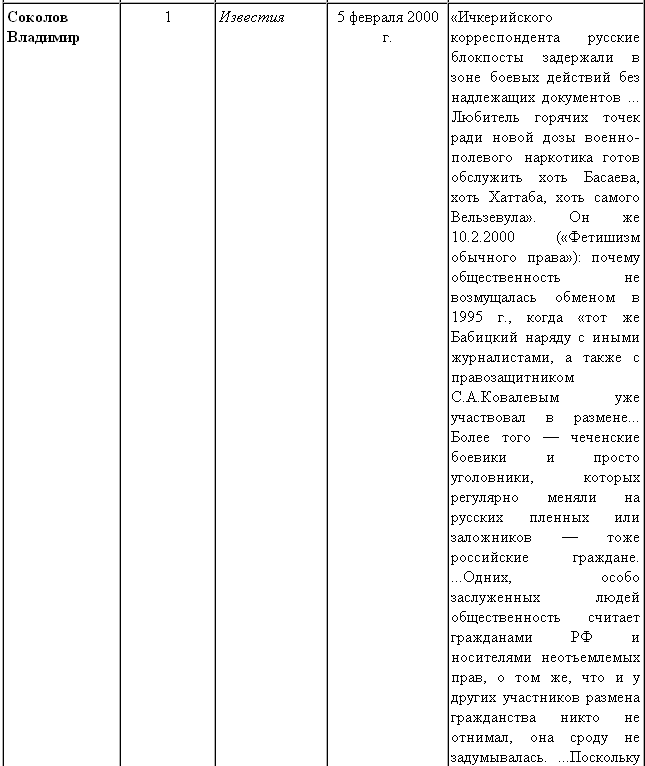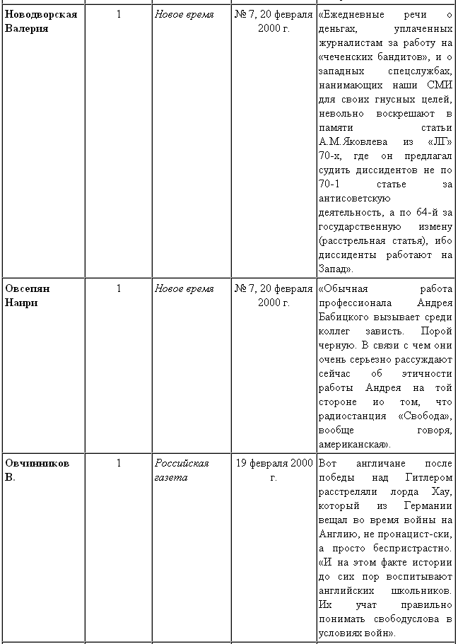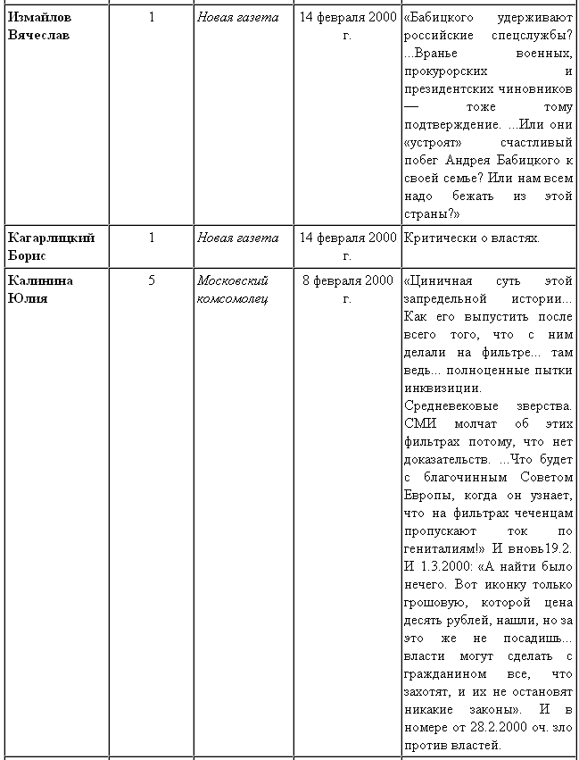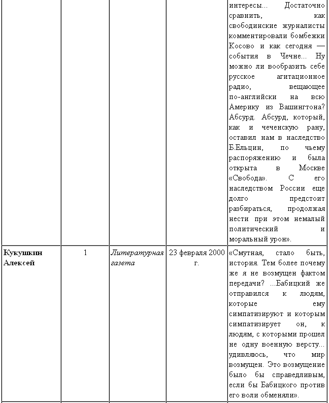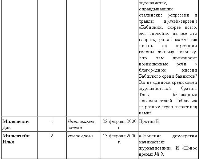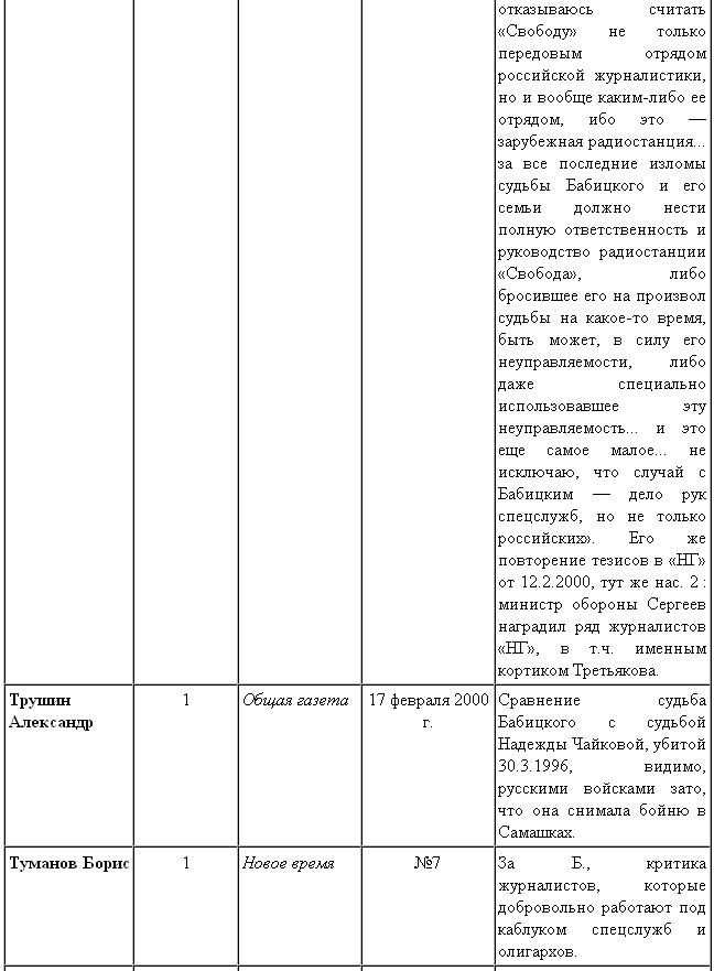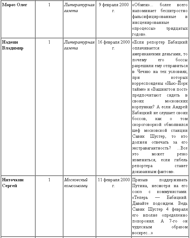 Мифологизм давал себя знать в неадекватной оценке числа противников. Е.Крутиков, последовательно защищавший милитаристский лагерь, издевался над «десятком известных журналистов «перестроечного» поколения» – на самом деле, как видно из табл. 2, в защиту Бабицкого выступило большинство журналистов, шесть десятков человек разного, видимо, возраста. В.Третьяков, напротив, приуменьшал количество противников Бабицкого и намекал на «демократическую цензуру»: «Все больше действительно честных журналистов боятся не то что возразить – даже сказать о случившемся не в тех выражениях и не тем тоном, что продиктован «Свободой» (В.Третьяков). Фраза, кстати, внутренне противоречива, не говоря уже о несоответствии ее фактам, ибо «действительно честный журналист» не будет поддаваться никакой цензуре – если поддается, значит, уже не честный. Впрочем, со стороны демократов тоже встречались необоснованные обобщения: «Самым поразительным… было то единодушие, с которым журналисты из самых различных изданий – и конкурирующих, и находящихся на различных политических позициях, и принадлежащих различным финансовым группам – осуждали действия властей… Заговорили на митинге, а не в своих изданиях, из которых «тема Бабицкого» под давлением закамуфлированных, но легко угадываемых сил начинает исчезать» (В.Яков).