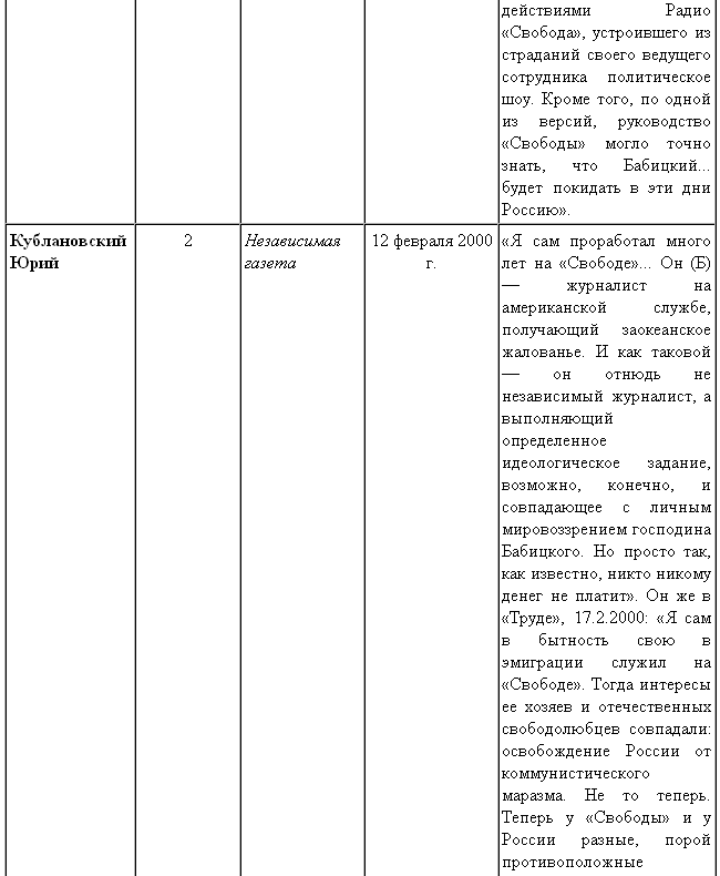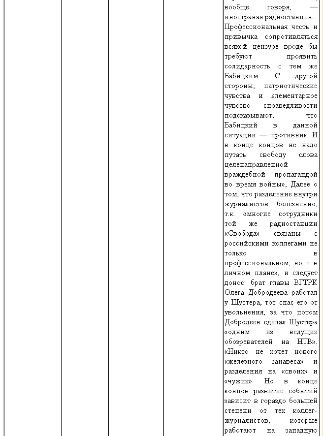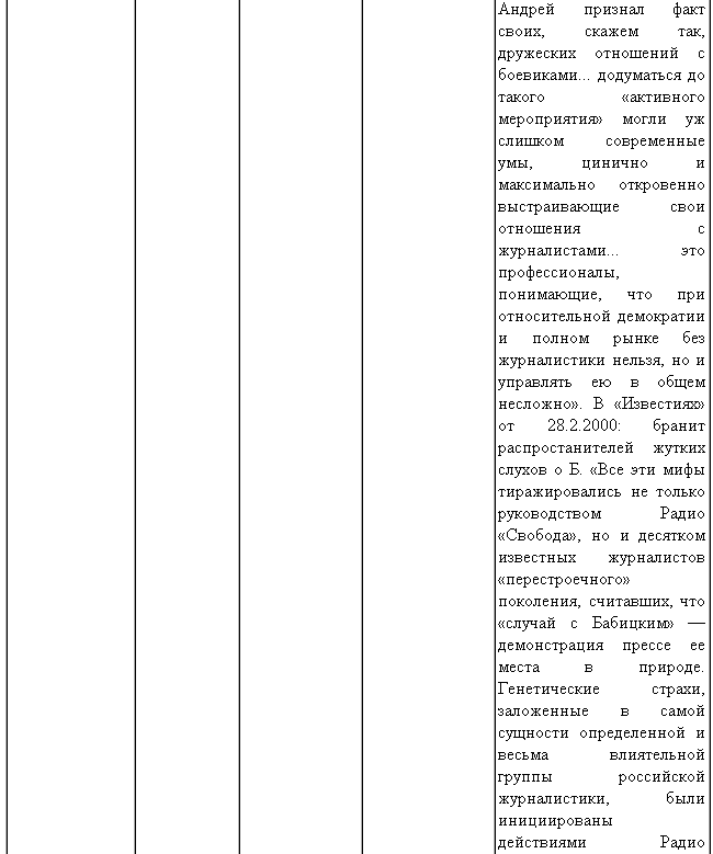 Впрочем, и не деньги, а сам факт работы на «Свободе» плох: «Российский гражданин и журналист зарубежной радиостанции, то есть зарубежный (по иностранному статусу) журналист Бабицкий. Это существенная разница. Более того – принципиальная» (В.Третьяков). Юридически, разумеется, никакой разницы нет, и если какой-либо «принцип» тут и прощупывается, то принцип отчуждения от идейного противника. Он не может быть соотечественником. «Бабицкий – иностранный журналист» (Б.Александров). «Бабицкий работал на американской радиостанции «Свобода» и выполнял в Чечне задания руководства этой станции» (С.Минаев).